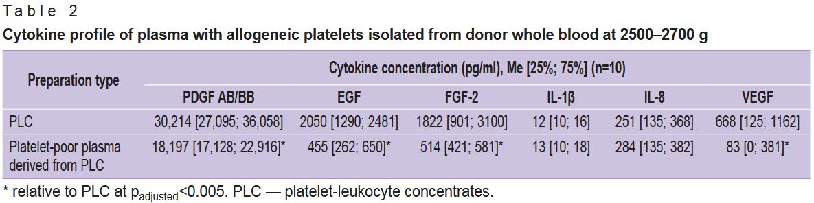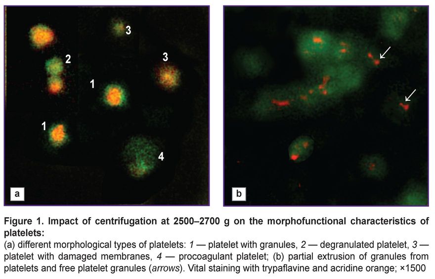 Materials and Methods. The study investigated donor blood platelets, platelets collected from donors via apheresis, and platelets isolated from donor whole blood (platelet-leukocyte concentrates, PLC). Platelet quality was assessed before and after centrifugation at 2500–4000 g, as well as the feasibility of producing platelet gel from platelet-rich plasma isolated from whole blood. Morphofunctional analysis of platelets was performed using an original method based on the examination of vitally stained cells by fluorescence microscopy. The cytokine profile in the platelet concentrates isolated from whole blood was evaluated using multiplex analysis.