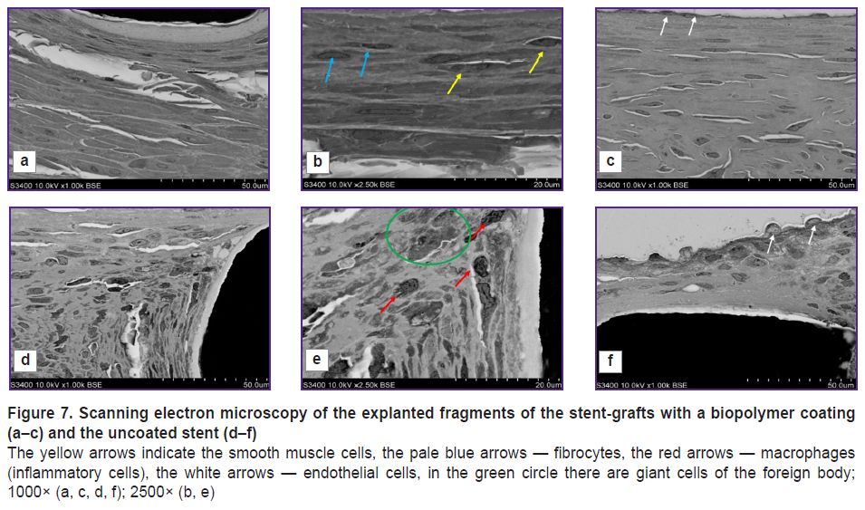 Materials and Methods. A biodegradable coating based on a copolymer of poly-D,L-lactide-co-glycolide (the polylactide-glycolide ratio — 50:50) and low-molecular sodium enoxaparin was applied on 8-mm-long metallic coronary Calipso stents by electrospinning. The sheep carotid artery was implanted with the coated stents (stent-grafts) and uncoated stents. The dynamic patency was assessed by color duplex ultrasound. Three months later, the artery–stent fragments were explanted, fixed with buffered formalin with post-fixation with osmium tetroxide, dehydrated in ethanol and acetone followed by impregnating with epoxy resin. After polymerization, the samples were ground and polished to the required depth. To enhance the contrast after polishing, the samples were treated with Reynolds lead citrate. The samples were visualized by scanning electron microscopy in the backscattered electron mode.