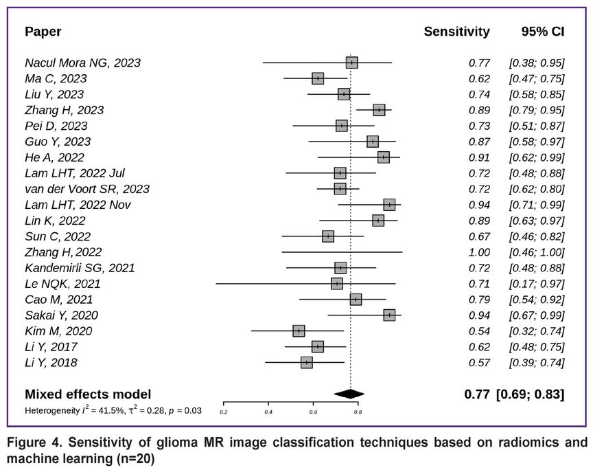 Figure 4 [7, 8, 10–14, 16, 18, 19, 21, 22, 25, 26, 29, 38, 39, 43–45] demonstrates the sensitivity of non-invasive glioma subtyping techniques based on radiomics and machine learning in the 20 studies reviewed. The generalized sensitivity in the reviewed publication series was 0.77 with a 95% CI [0.69; 0.83].