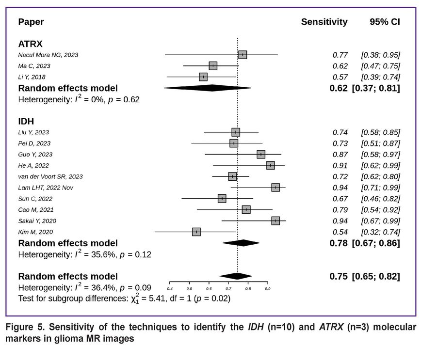 The sensitivity of the techniques for detecting the IDH and ATRX gene mutation status is shown in Figure 5 [7, 8, 10, 12–14, 18, 19, 21, 29, 39, 44, 45]. The generalized sensitivity of the models for IDH mutation detection equalled to 0.78 with a 95% CI [0.67; 0.86], while for ATRX this metric was lower — 0.62 with a wider 95% CI [0.37; 0.81].