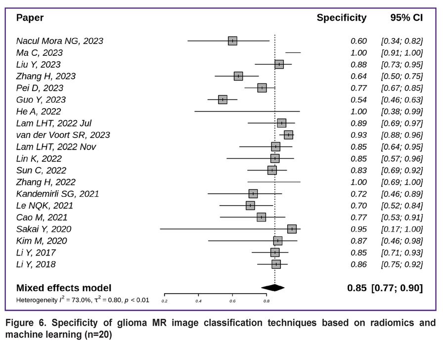 The specificity of diagnostics based on radiomics and machine learning is demonstrated in Figures 6 and 7. The overall specificity of the studied techniques exceeded the sensitivity and was equal to 0.85 with a 95% CI [0.77; 0.90] (Figure 6) [7, 8, 10–14, 16, 18, 19, 21, 22, 25, 26, 29, 38, 39, 43, 44, 45].