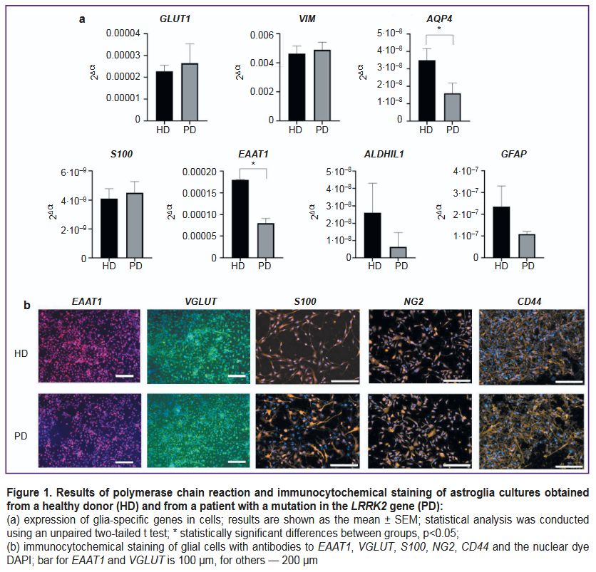 Both cell lines expressed the required pattern of glia-specific genes and synthesized glia-specific proteins (Figure 1). Here, some glia-specific genes (AQP4, EAAT1) were expressed at reduced levels in cultures with the LRRK2 gene mutation compared to controls.