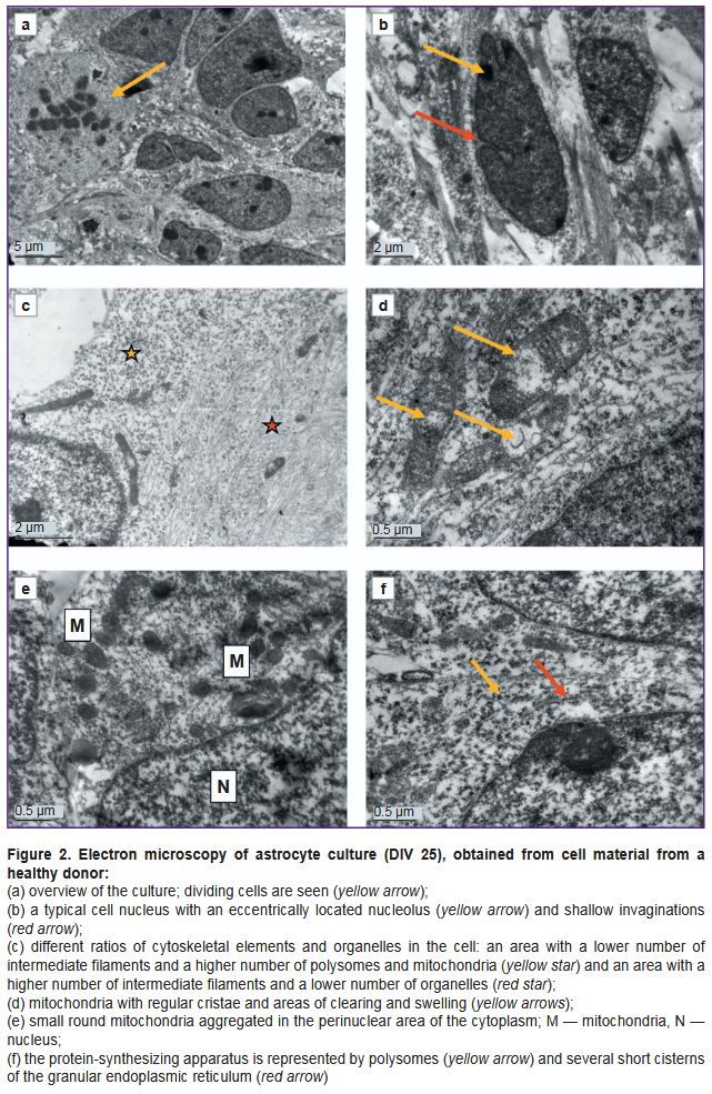 Ultrastructure of astrocytes differentiated from iPSCs of a conditionally healthy donor. Control astrocyte cultures had uniform cells with moderately electron-clear cytoplasm and clear nuclei. There were dividing cells, with virtually no dying cells (Figure 2 (a)). Cell nuclei were predominantly moderately electron-clear, with evenly distributed chromatin and a prominent, eccentrically located nucleolus. Small, evenly distributed clumps of heterochromatin were found in the nucleus. Shallow invaginations were seen in the nuclei of some cells (Figure 2 (b)). The cytoplasm was poorly populated with organelles and primarily filled with a fine network of intermediate filaments and polysomes (see Figure 2 (b); Figure 2 (c)). The hyaloplasm was characterized by electron transparency, which is also typical of normal human brain astrocytes. The cytoskeleton constituted the main element of the cell ultrastructure and consisted of a network of fine threads forming intermediate filaments. In some cells, the cytoskeleton was uniformly distributed, whereas in other cells, areas with denser and sparser clusters of filaments were found. A chaotic orientation of filaments was seen in the cell body, whereas in the processes, the filaments were arranged in parallel to each other. There were cells in which one part of the cytoplasm was filled with a dense network of filaments with a small number of polysomes in between, while another part, on the contrary, had predominating polysomes and contained few cytoskeletal elements (see Figure 2 (c)). Probably, the areas of the cytoplasm with a large number of polysomes were areas in which active production of proteins for cytoskeletal construction was only started. Mitochondria were predominantly elongated, with an electron-dense matrix and regular cristae. In specific mitochondria, loci of clearing and swelling were seen; they were located either in the center or at the end of the organelle (Figure 2 (d)). Modified mitochondria with destructed cristae were also observed. Mitochondria were few in number, scattered individually or aggregated near the nucleus or at the sites of processes branching (Figure 2 (e)). Isolated contacts of mitochondria with each other and with the nucleus were identified. The protein-synthesizing apparatus consisted predominantly of free ribosomes and polysomes. Distinct short cisternae of the granular endoplasmic reticulum (ER) were rare (Figure 2 (f)). The Golgi apparatus was poorly developed and had sporadic dictyosomes in it.