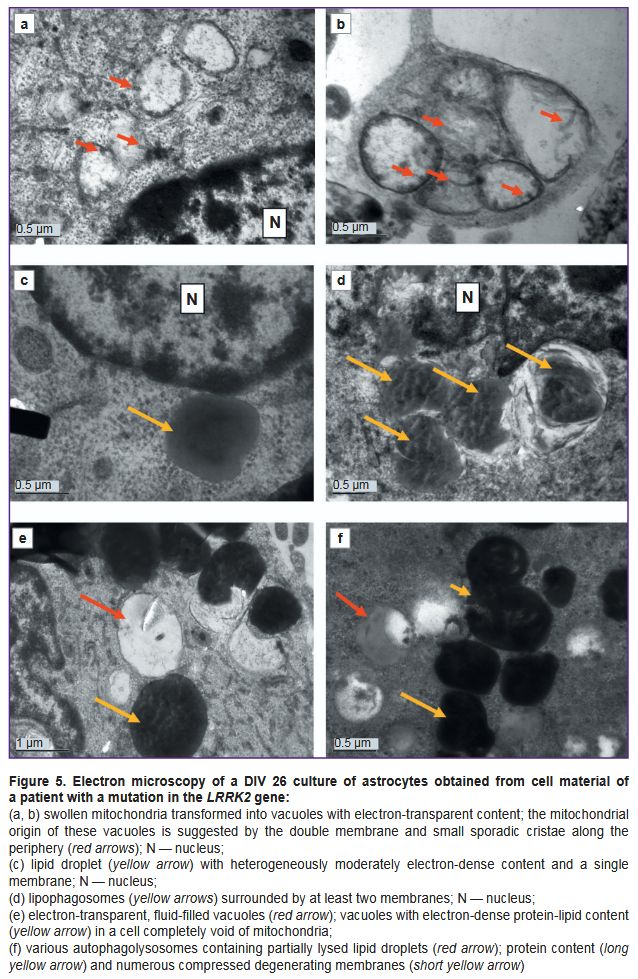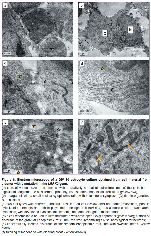 Conclusion. Reprogramming and obtaining of astrocytes from iPSCs received from a donor with a PD-associated mutation in the LRRK2 gene allow to assess the nature and dynamics of pathological morphochemical and ultrastructural changes caused by the mutation during gliogenesis. The use of combined techniques (PCR, immunocytochemistry, TEM) to compare cell cultures differentiated from iPSCs allow to assess, on the one hand, general culture parameters, such as the dynamics of culture differentiation based on changes in the expression level of specific genes and immunocytochemical markers, and on the other hand, morphofunctional changes at the level of individual cells. TEM demonstrates significant potential for studying cell cultures differentiated from iPSCs. This technique is instrumental for phenotyping the resulting cells based on their ultrastructure, assessing the degree of their morphological maturity, and identifying minor ultrastructural changes in cells, both pathological and differentiation-associated. The results of this TEM-based study indicate a pronounced decrease in mitochondrial viability and other ultrastructural abnormalities, thus confirming the idea of a significant role of astroglia in the development of the neurodegenerative process in the LRRK2-associated PD; hence, astroglia can be a basis for development of new approaches as well as for searching pharmacological targets in the pathogenetic therapy of the disease.