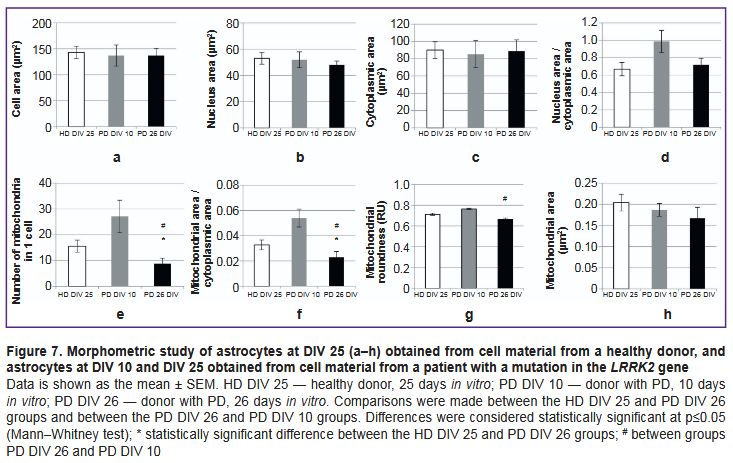 Results. PCR analysis and immunocytochemical staining demonstrated that cell lines received from a healthy donor and a PD patient expressed the required pattern of glia-specific genes and synthesized astrocyte-specific proteins. However, some glia-specific genes were expressed at reduced levels by mutant cells. One of the most typical ultrastructural features of astrocytes received from iPSCs from a PD patient was destructive changes in mitochondria, including mitochondrial clearing, swelling, and cristae destruction. In many cells, mitochondria were completely absent after a long culturing. Another characteristic feature of cells with a mutation in the LRRK2 gene was the accumulation of vacuoles with contents of varied electron density. Distinct changes in the ultrastructure of nuclei, protein-synthesizing organelles, and cytoskeletal elements were also seen in cultured astrocytes with a PD-associated LRRK2 mutation. Here, the morphometric study did not reveal any differences in the average cell area, nuclear area, cytoplasm area, or nuclear-cytoplasmic ratio between astrocytes of the control line and the PD mutation line.