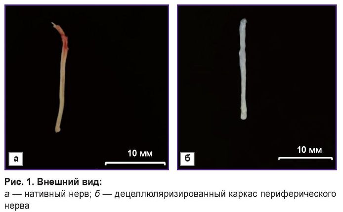 Регенерация дефектов периферических нервов продолжает оставаться комплексной проблемой, несмотря на развитие новых биоматериалов и методов лечения [1]. Нервные трансплантаты используют для восстановления нервов в тех случаях, когда дефект превышает 5 мм и нет возможности для прямого сшивания без натяжения. Аутотрансплантация нерва остается основным методом хирургического лечения протяженных травм периферических нервов в клинической практике, направленным на восстановление их функциональности. Однако данный метод имеет свои недостатки, в число которых входят дефицит донорского материала, сложность его получения и продолжительный период послеоперационного восстановления [2]. Децеллюляризированные нервные каркасы представляют собой эффективный подход к лечению поврежденных периферических нервов, позволяя избежать недостатков аутотрансплантации [3]. Эти каркасы выполняют опорную функцию и стимулируют направленную регенерацию нерва [4]. Результаты недавних исследований, проведенных как in vitro, так и in vivo, подчеркивают стимулирующее воздействие децеллюляризированного внеклеточного матрикса (ВКМ) на восстановительные процессы. Компоненты ВКМ обладают репаративным потенциалом и положительно влияют на скорость аксонального восстановления [5–7]. Процесс получения аллогенных или ксеногенных тканевых каркасов на основе ВКМ включает разнообразные физические, химические и ферментативные методы обработки, однако существенной проблемой остается отсутствие стандартизированных протоколов получения децеллюляризированных тканей для регенеративной медицины [8, 9]. Оптимизация протокола получения децеллюляризированных нервов обеспечит получение наиболее подходящего материала для имплантации и стимуляции регенеративных процессов при лечении повреждений периферического нерва.