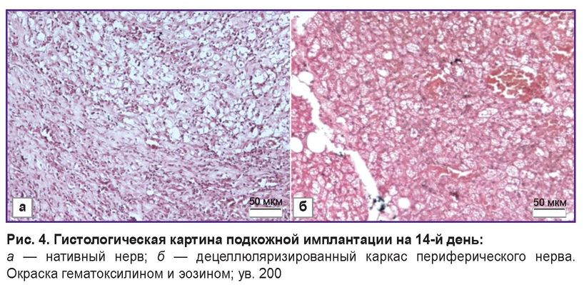 Подкожная имплантация продемонстрировала отсутствие воспалительного ответа на децеллюляризированный каркас. Гистологическая оценка показала отсутствие макрофагов и нейтрофилов в области между децеллюляризированным каркасом и прилегающей тканью (рис. 4, б). В то же время имплантация нативного нерва показала значительную лимфо-макрофагальную инфильтрацию (рис. 4, а).