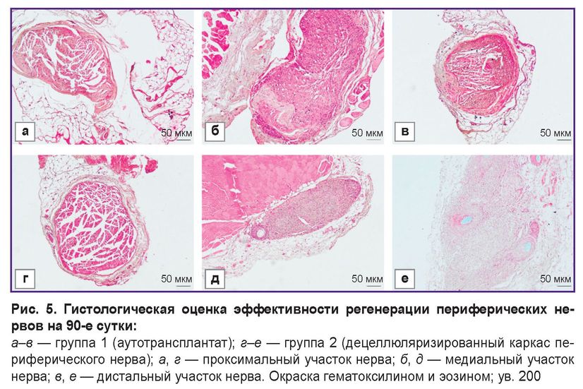 В исследовании E. Contreras и соавт. [20] была проведена оценка эффективности восстановления дефекта (15 мм) седалищного нерва у крыс. Децеллюляризированный каркас нерва показал перспективные результаты при регенерации аксонов. Гистологическое исследование выявило оптимальную сохранность структуры ВКМ, а также наличие многочисленных регенерированных миелинизированных и немиелинизированных аксонов в медиальной и дистальной частях децеллюляризированного каркаса после имплантации. Иммуногистохимическое окрашивание продемонстрировало наличие многочисленных аксонов, окруженных шванновскими клетками вдоль децеллюляризированного нерва. У децеллюляризированного каркаса регенерация происходила медленнее, а шванновские клетки располагались более свободно по сравнению с аутотрансплантатом. В нашем исследовании применение децеллюляризованного каркаса нерва способствовало восстановлению протяженного дефекта периферического нерва крысы. Каркас обладал трехмерной сетчатой структурой нативных нервов, которая определяла направление роста аксонов. Результаты иммуногистохимического и гистологического окрашивания продемонстрировали способность децеллюляризованного каркаса нерва стимулировать процессы регенерации двигательных и чувствительных волокон в поврежденном периферическом нерве крысы. Наблюдалось также увеличение количества мелких миелинизированных волокон в медиальной части и умеренное количество неповрежденных нервных волокон по всему каркасу.