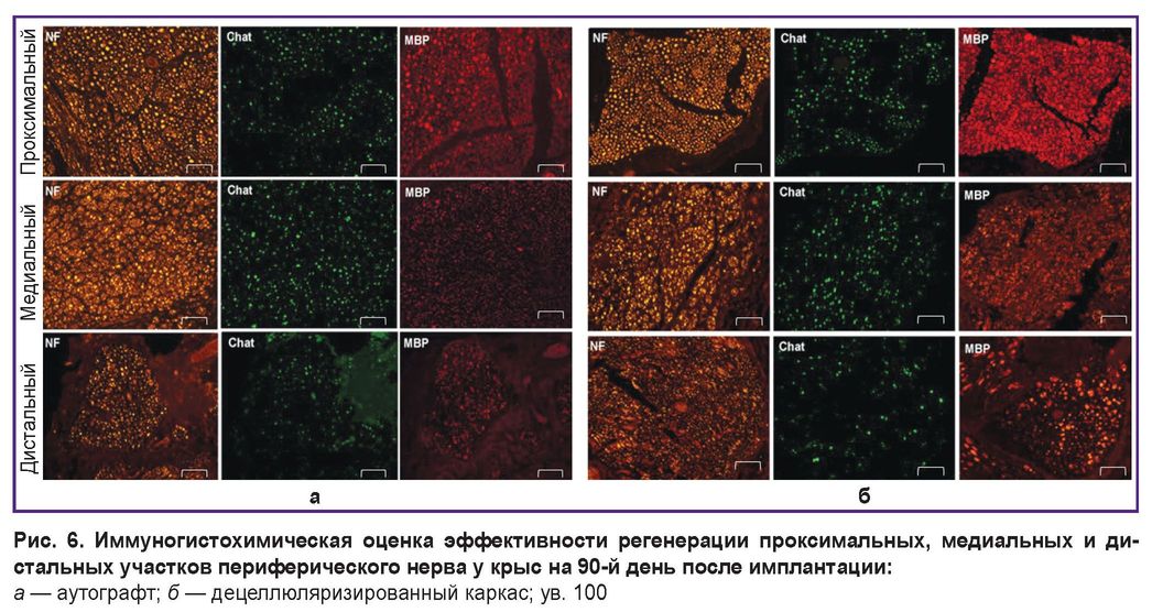 После окрашивания антителом к MBP нервные волокна были разделены на два типа. Первый тип состоял из мелких волокон размером 1–6 мкм, которые свидетельствуют о регенерации нерва. Второй тип характеризовался большими волокнами размером 7–20 мкм, которые, вероятно, уже присутствовали до начала исследования. На рис. 6 показано, что наблюдалось четкое увеличение количества мелких волокон в медиальных сегментах по сравнению с другими фрагментами нерва. Кроме того, количество ChAT-позитивных волокон в общем количестве нервных волокон (NF) сохранялось в равновесии с лимитом для ChAT в 40%. В результате произошло восстановление двигательных и чувствительных волокон. Во всех образцах отмечено увеличение количества мелких миелинизованных волокон в медиальной зоне. Таким образом, полученные результаты демонстрировали высокую регенеративную способность экспериментального материала при повреждении периферического нерва у крыс.