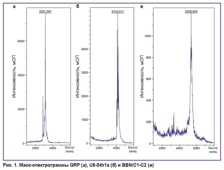 Рис. 1. Масс-спектрограммы GRP (а), U5-Sth1a (б) и BBN/C1-C2 (в) |