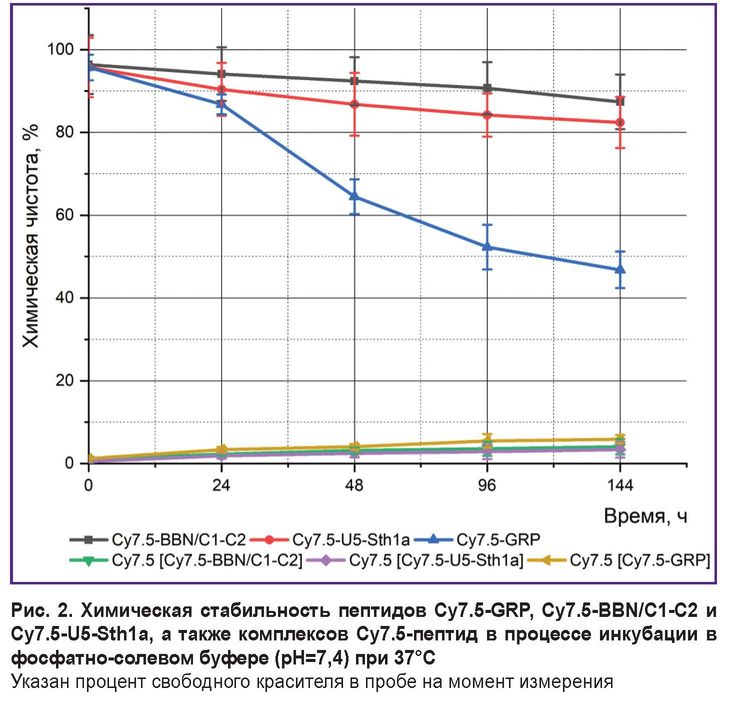 После синтеза пептиды были успешно помечены флуоресцентным зондом Cy7.5. Проанализирована стабильность как целых молекул, так и комплексов [Cy7.5]-пептид (рис. 2). Отмечено, что стабильность пептида Cy7.5-GRP значительно снижается в первые 48 ч (с 95,7 до 64,5%) и продолжает уменьшаться на протяжении следующих 144 ч, достигая 46,8%. Пептиды Cy7.5-BBN/C1-C2 и Cy7.5-U5Stha1 более стабильны в фосфатно-солевом буфере при нагревании. Химическая чистота Cy7.5-BBN/C1-C2 снижается с 96,4 до 87,4% за 144 ч, а Cy7.5-U5Stha1 — с 95,7 до 82,4%. Анализ стабильности комплексов пептидов с красителем показал, что в процессе инкубации в фосфатно-солевом буфере за 144 ч теряется около 5% красителя во всех группах.