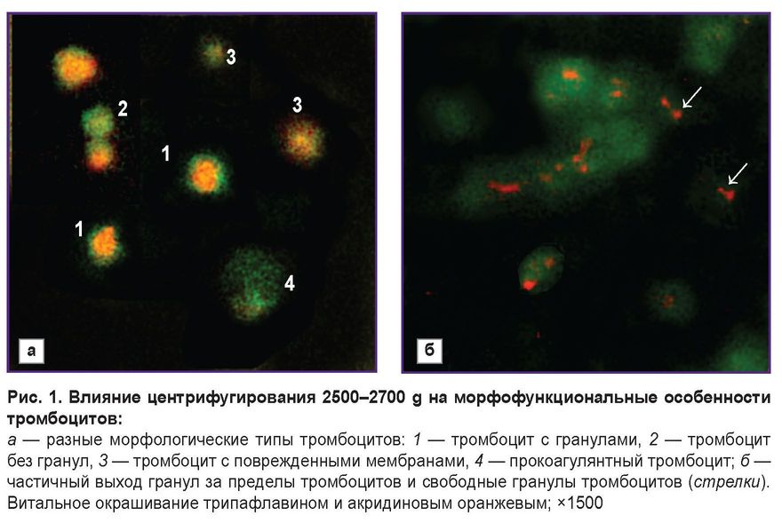 Материалы и методы. В работе исследовали тромбоциты крови доноров; тромбоциты, заготовленные у доноров путем аппаратного афереза; тромбоциты, выделенные из цельной крови доноров (тромболейкоцитарные концентраты, ТЛК). Оценивали качество тромбоцитов до и после центрифугирования с ускорением 2500–4000 g, а также возможность получения тромбоцитарного геля на основе плазмы с тромбоцитами, выделенной из цельной крови. Морфофункциональный анализ тромбоцитов проводили с использованием оригинального метода, основанного на исследовании витально окрашенных клеток с помощью флуоресцентной микроскопии. В концентратах тромбоцитов, выделенных из цельной крови, оценивали цитокиновый состав с применением мультиплексного анализа.
