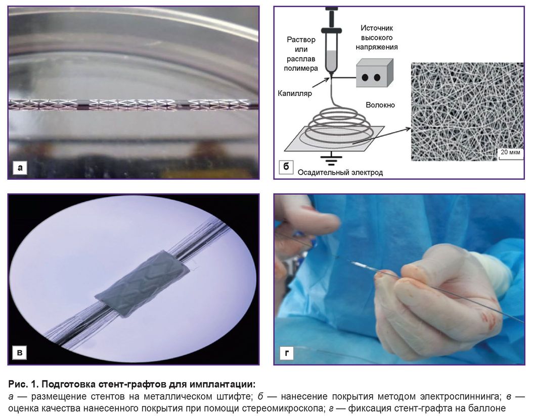 Для покрытия биополимерной мембраной были использованы металлические коронарные стенты «Калипсо» («Ангиолайн», Россия) длиной 8 мм, диаметром 4 и 4,5 мм. Для получения покрытия готовили 15% раствор сополимера поли-D,L-лактида-со-гликолида с молекулярной массой 30 000–45 000 г/моль и соотношением лактида и гликолида 50:50 («Новохим», Россия), растворенного в гексафторпропаноле (1,1,1,3,3,3-гексафтор-2-пропанол), чистота ≥99,8% (Sigma-Aldrich, США). Полимер размешивали на магнитной мешалке в течение 12 ч при комнатной температуре до полного растворения. Для придания гемосовместимости и снижения риска тромбоза в раствор полимера добавляли низкомолекулярный гепарин Эниксум (эноксапарин натрия), после чего размешивали раствор еще в течение 30 мин. Стенты размещали на металлическом штифте диаметром 1,0 мм (рис. 1, а). Полимерное покрытие наносили методом электроспиннинга (рис. 1, б) на установке Nanon-01A (MECC CO, Япония). При помощи стереомикроскопа оценивали качество нанесенного покрытия (рис. 1, в). Толщина полимерного покрытия составляла 80–90 мкм. После высыхания стент-графт помещали на баллон (рис. 1, г) и стерилизовали методом радиационного излучения.