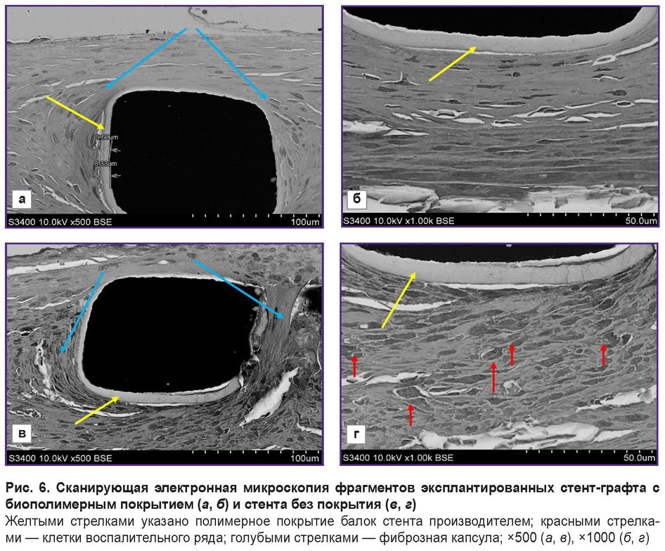 У артерий с имплантированными стентами и стент-графтами различались не только толщина и морфология неоинтимы, но и клеточный состав. Во всех образцах наблюдали классическую картину образования плотной фиброзной капсулы, которая отделяет металлические балки стента от кровотока и структурных элементов артерии. При увеличении в 1000 раз (рис. 6, б, г) видно сохранившееся полимерное покрытие, нанесенное при изготовлении стента, а вокруг — новообразованные ткани, состав которых значительно различается. Балки стента без мембраны окружают многочисленные клетки воспалительного ряда (см. рис. 6, г), балки стент-графтов окружает компактный слой без признаков воспаления (см. рис. 6, б).