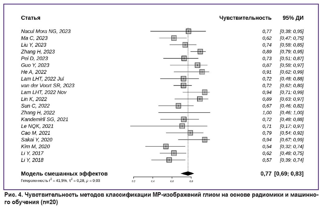 На рис. 4 [7, 8, 10–14, 16, 18, 19, 21, 22, 25, 26, 29, 38, 39, 43–45] представлена чувствительность методов неинвазивного типирования глиом на основе радиомики и машинного обучения для 20 изученных работ. Обобщенная чувствительность в изученной серии публикаций составила 0,77 с 95% ДИ [0,69; 0,83].