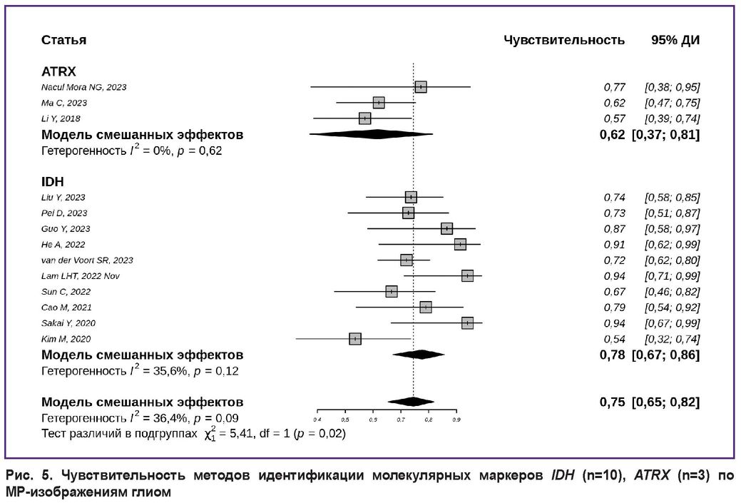 Проанализированы 42 публикации, в которых на основе методов радиомики и машинного обучения по данным МР-изображений глиальных опухолей прогнозировали статус молекулярных биомаркеров, включая мутации генов IDH, ATRX, BRAF, H3K27M, промотора TERT, коделецию 1p/19q, метилирование промотора гена MGMT, пролиферативную активность (индекс мечения Ki-67) и др. Обобщенная точность таких методов оказалась высокой и составила 0,86 [0,83; 0,89]. Тем не менее в работах выявлена существенная методологическая гетерогенность, в частности связанная с отсутствием единых стандартов выбора положения, размера и формы зоны интереса для извлечения лучевых биомаркеров, что является серьезным препятствием для воспроизведения полученных экспериментальных результатов в клинической практике. Следовательно, вопрос стандартизации методов радиомики остается актуальным для дальнейших исследований глиальных опухолей.
