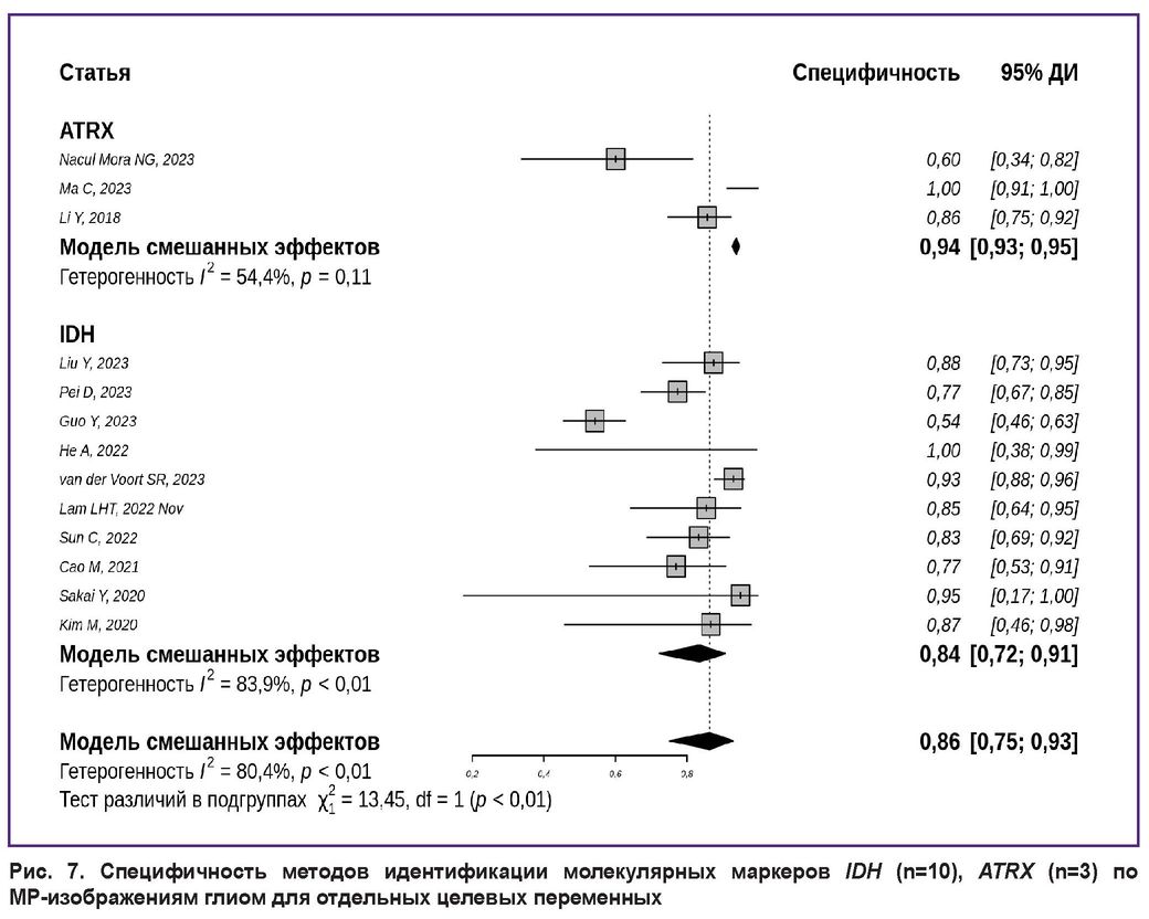 Максимальная специфичность отмечена для детекции мутаций ATRX (0,94 с 95% ДИ [0,93; 0,95]), для определения мутации в гене IDH она была несколько ниже (0,84 с 95% ДИ [0,72; 0,91]) (рис. 7) [7, 8, 10, 12–14, 18, 19, 21, 29, 39, 44, 45].