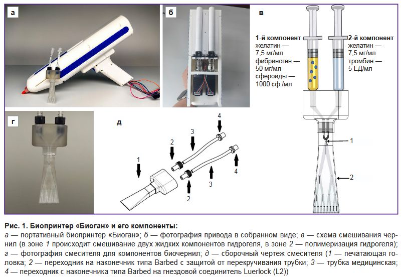 Получение биочернил. Разработанные биочернила состояли из сфероидов (1000 кл./сф.), полученных из МСК-ЖТ человека в концентрации 1000 сф./мл гидрогеля. Гидрогелевый компонент биочернил изготовлен из фибрина и желатина. Разработанные биочернила включают два жидких компонента, при смешивании которых с использованием смесителя (см. рис. 1, г) происходит полимеризация и гидрогель застывает на поверхности раны.