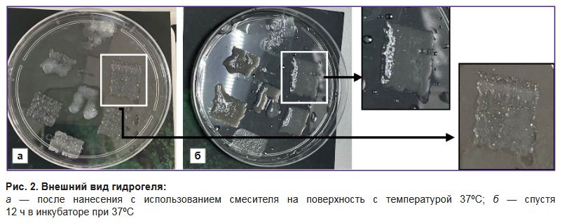 Для проверки печатаемости чернил описанные компоненты загружали в картриджи и с использованием биопринтера наносили на поверхность чашки Петри с температурой 37ºC (рис. 2, а). Затем в течение 12 ч гидрогель держали при 37ºC, чтобы убедиться, что он полностью заполимеризовался (рис. 2, б). При использовании непрерывного режима наилучшая печатаемость достигалась при объемной скорости подачи биочернил, равной 0,2 мл/с. При этом осуществлялось равномерное экструдирование потока материала и смешивание компонентов чернил, что обеспечивало сохранение формы с четкими границами нанесенного слоя. При использовании импульсного режима оптимальными параметрами печати были объемная скорость 0,2–0,5 мл/с при частоте импульсов 15–20 в минуту.