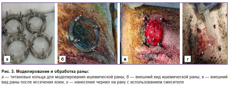 Моделирование раны. Для моделирования ишемической раны применяли метод, основанный на использовании титановых колец для сдавливания кожи, который ранее применялся в аналогичных исследованиях [25]. Для эксперимента был выбран самец вьетнамской вислоухой свиньи породы везинау в возрасте 1 год массой тела 45 кг. Перед операцией свинью седировали 12 мг/кг Золетила и 12 мг/кг Медитина и очищали кожу. Первичная операция заключалась в создании карманов на боковых поверхностях животного посредством рассечения внешнего покрова и отделения дермы от подкожно-жировой клетчатки слева и справа от изначального разреза. Всего было по два иссечения с каждого бока на расстоянии 25 см друг от друга. В получившиеся карманы внедряли нижние уплотнительные кольца из титана с болтами (d=5 см) (рис. 3, а). Устройством для панч-биопсии (Apexmed, Индия) диаметром 8,0 мм проделывали отверстия для болтов, после чего устанавливали верхнее кольцо и фиксировали его винтами (рис. 3, б). Спустя 24 ч свинью снова седировали, проводили предоперационную подготовку, после чего, удалив верхнее кольцо, иссекали кожу по диаметру (рис. 3, в). Затем наносили гидрогель со сфероидами или без в зависимости от группы с использованием смесителя (рис. 3, г), а контрольную рану оставляли без лечения. Раны обрабатывали с интервалом в 3–4 дня. Антибиотикотерапию проводили каждый день с использованием цефтриаксона в дозе 20 мг/кг и 5% энрофлоксацина в дозе 45 мг/кг, анальгетическую терапию — с использованием мелоксикама в дозе 300 мг/кг. На 18-й день после операции вновь наносили биочернила. На 36-й день животное выводили из эксперимента Пропофолом-Липуро (10 мг/кг) и лидокаином (10 мг/кг), после чего образцы тканей передавали на гистологическое исследование.
