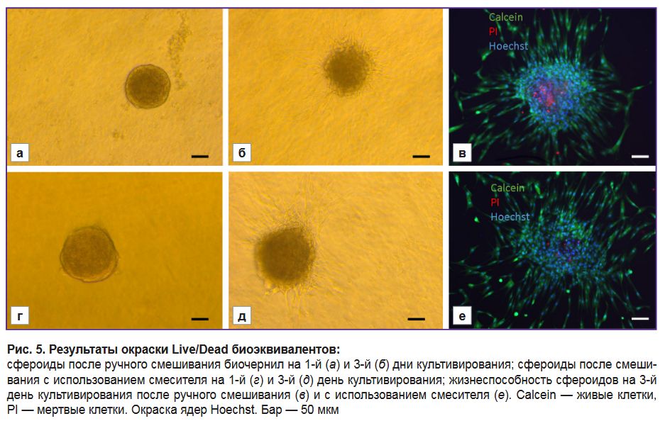 Оценка жизнеспособности сфероидов в составе биочернил. Для подтверждения того, что при использовании смесителя сохраняется жизнеспособность сфероидов, была проведена оценка качества полученного биоэквивалента. Для этого биочернила наносили на поверхность чашки Петри с использованием биопринтера «Биоган», а также вручную (стандартным смешиванием) в качестве контроля. Затем сфероиды культивировали в течение 3 дней в стандартной ростовой среде и проводили окраску Live/Dead с использованием красителя CalceinAM (Sigma-Aldrich, Германия) и пропидий йодида. Ядра клеток окрашивали Hoechst 33258 (Thermo Fisher Scientific, США) и анализировали с помощью флуоресцентного микроскопа Evos (Thermo Fisher Scientific, США).