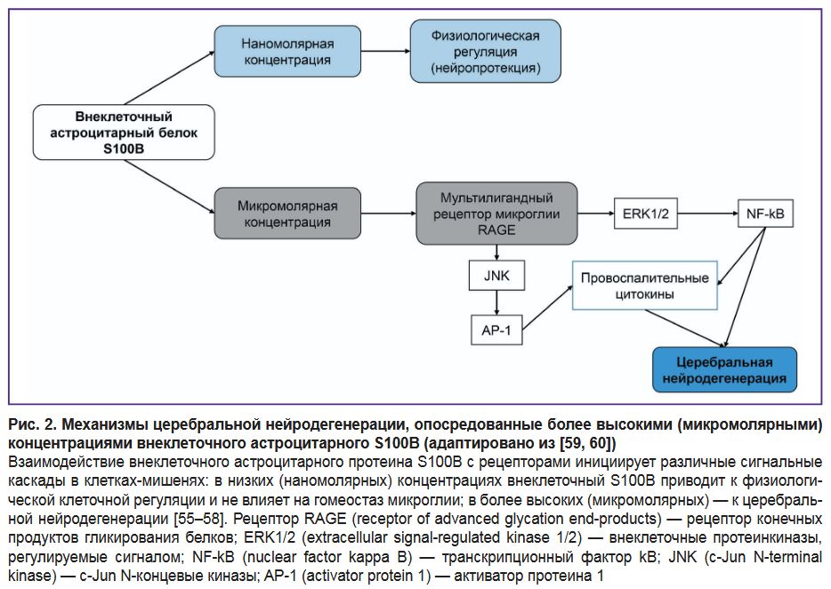 Белок S100B (молекулярная масса 21 кДа) — кальций-связывающий протеин семейства S100, сконцентрированный в центральной нервной системе преимущественно в астроцитах [21, 55–57]. Ряд авторов [55, 57, 58] относят S100B к одному из маркеров повреждения головного мозга. В то же время F. Michetti и соавт. [57] предполагают, что сам внеклеточный белок S100B может являться не только биомаркером повреждения, но и самостоятельным патогенетическим фактором, провоцирующим нейровоспаление и ЦНД. Развитие ЦНД на фоне патологически повышенных (микромолярных) концентраций внеклеточного белка S100B происходит посредством активации внутриклеточных путей (внутриклеточной перегрузки кальцием, накопления активных форм кислорода), высвобождения микроглией провоспалительных цитокинов и активации апоптоза нейронов (рис. 2) [55–60].
