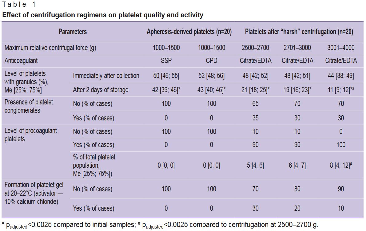 Table 1. Effect of centrifugation regimens on platelet quality and activity |