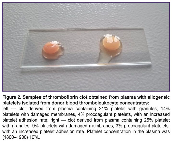 Nowadays, there are no standardized methods for obtaining applicative biological products, specifically PG and thrombofibrin clot, and there is no precise understanding of the quality of allogeneic platelets used for creating these preparations [8]. PG is often prepared by preliminary freezing of platelet-rich plasma followed by plasma activation with calcium preparations at temperature of 37°C [9–11]. However, this approach is accompanied by the loss of many growth factors and does not allow the usage of the functional features of platelets during PG formation due to their cryodestruction. Therefore, the search for methods aimed to improving the efficiency of selecting and using allogeneic platelets in the creation of applicative biological preparations is up-to-date.