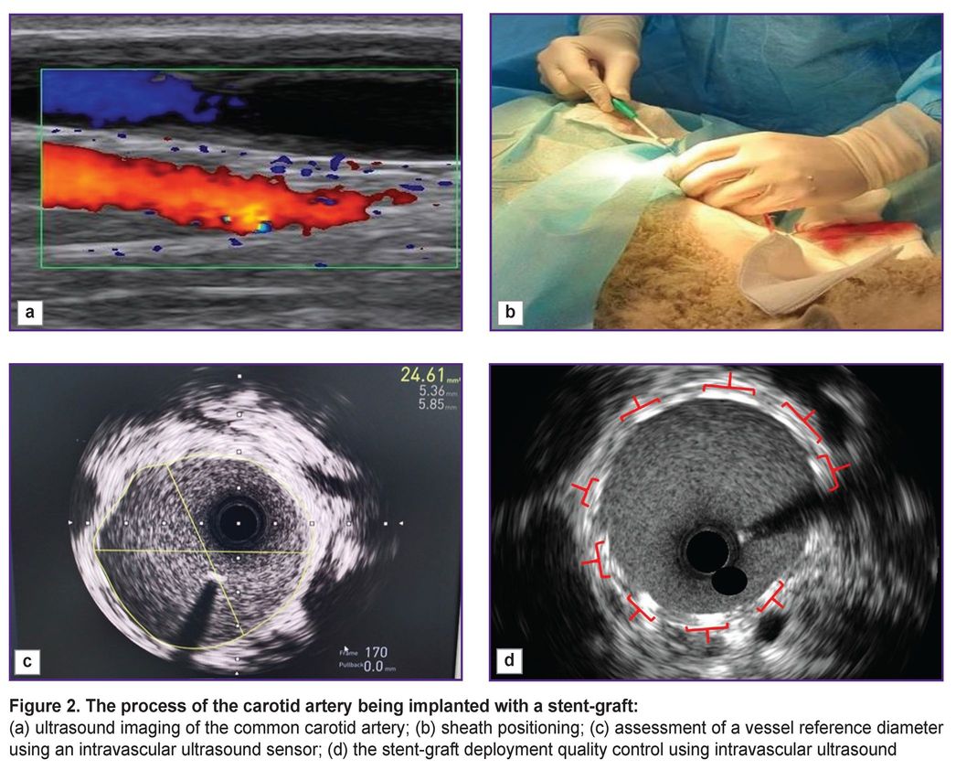 Then a stent-graft was positioned parallel to IVUS sensor, 0.5–1.0 cm distally. After positioning, under the guidance of subcutaneous and intravascular US, the common carotid artery was implanted with the stent-graft. The deployment was controlled by IVUS; in case of malposition and/or incomplete deployment, there was performed post-dilation using a balloon (up to 16 atm) followed by the result re-assessment. IVUS was used to evaluate the deployment area, apposition, as well as the presence of dissections (Figure 2 (d)).