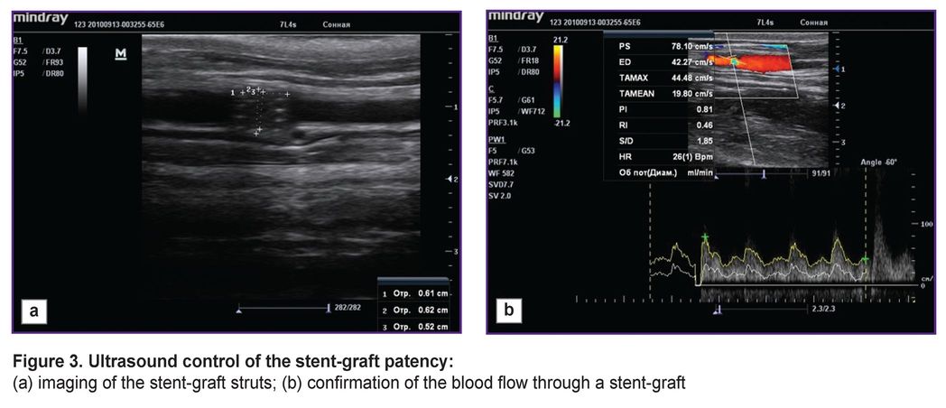 (а) imaging of the stent-graft struts; (b) confirmation of the blood flow through a stent-graft |