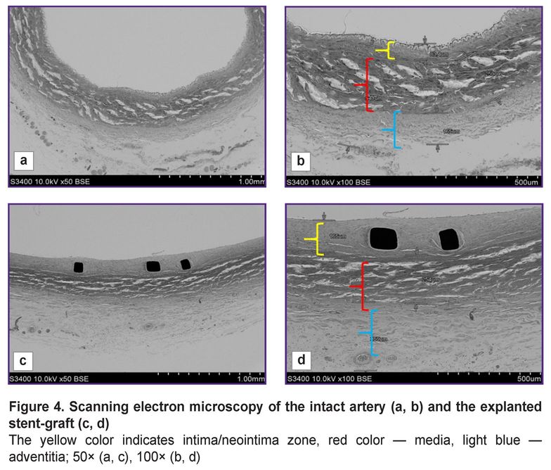 When compared using SEM the condition of the intact artery adjacent to the implanted stent-graft, and the arterial fragment with the implanted stent-graft, we stated that the structure of the arterial layers was similar: there was visualized intima/neointima, the layers of media and adventitia (Figure 4). When hundredfold magnified, it could be seen that the dimensions of media and adventitia layers on average were 250 and 200 µm, respectively, in both — in the intact artery and in the artery with the stent-graft (Figure 4 (b, d)); although the dimensions of the inner layer were different: the intima thickness in the intact artery was no more than 85 µm, while the neointima thickness in the implantation zone was twice as large reaching 165 µm.