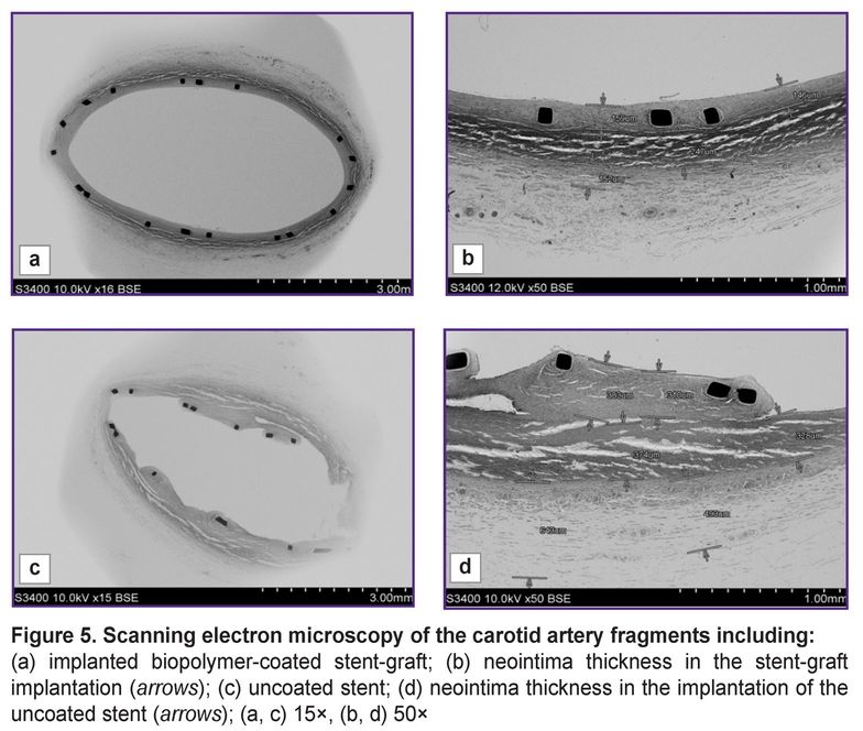 Materials and Methods. A biodegradable coating based on a copolymer of poly-D,L-lactide-co-glycolide (the polylactide-glycolide ratio — 50:50) and low-molecular sodium enoxaparin was applied on 8-mm-long metallic coronary Calipso stents by electrospinning. The sheep carotid artery was implanted with the coated stents (stent-grafts) and uncoated stents. The dynamic patency was assessed by color duplex ultrasound. Three months later, the artery–stent fragments were explanted, fixed with buffered formalin with post-fixation with osmium tetroxide, dehydrated in ethanol and acetone followed by impregnating with epoxy resin. After polymerization, the samples were ground and polished to the required depth. To enhance the contrast after polishing, the samples were treated with Reynolds lead citrate. The samples were visualized by scanning electron microscopy in the backscattered electron mode.