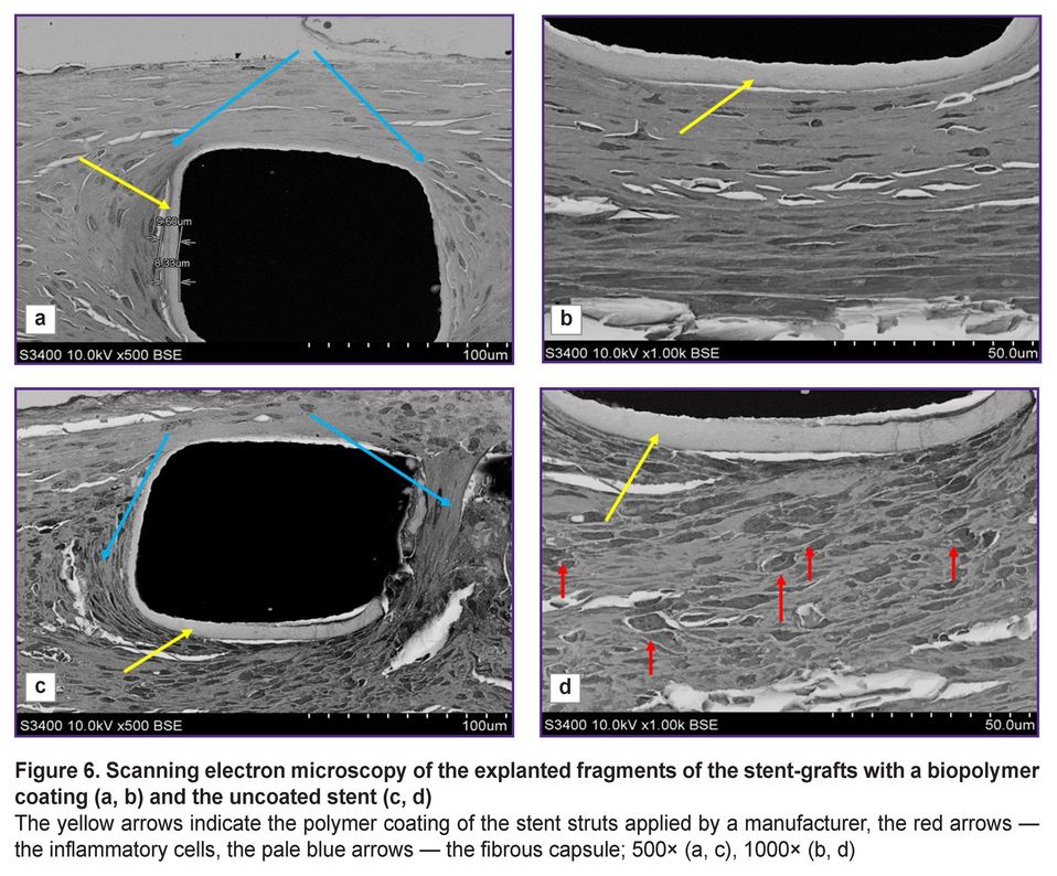 The stent functionality was assessed by CDS on day 3, as well as in 1 and 3 months after the surgery. The animals were sacrificed 3 months after the stent implantation. For comparison, an intact (native) carotid arterial fragment adjacent to the stent-graft was chosen as a reference. The explanted stent-grafts/stents were subjected to macro- and microscopic examination. There were assessed the integration of the stents with the carotid artery, the presence of an inflammatory response, the polymer coating degradation pattern, the neointima formation characteristics using an original method: EM-BSEM consisting in embedding the whole fragments of the explanted material into epoxy resin followed by studying using scanning electron microscopy (SEM) in back-scattered electrons [17]. The method enabled to take high-resolution photomicrographies, which were visually similar to the images by transmission electron microscopy.