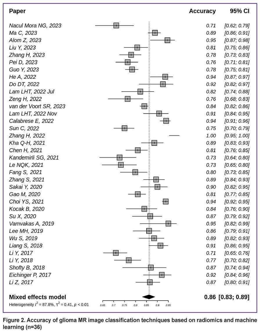 Figure 2 [7–42] demonstrates the accuracy of machine learning models and its generalization for 36 of 42 papers for which the authors managed to assess accuracy metrics. The generalized accuracy in the analyzed publications was 0.86 with 95% CI [0.83; 0.89].