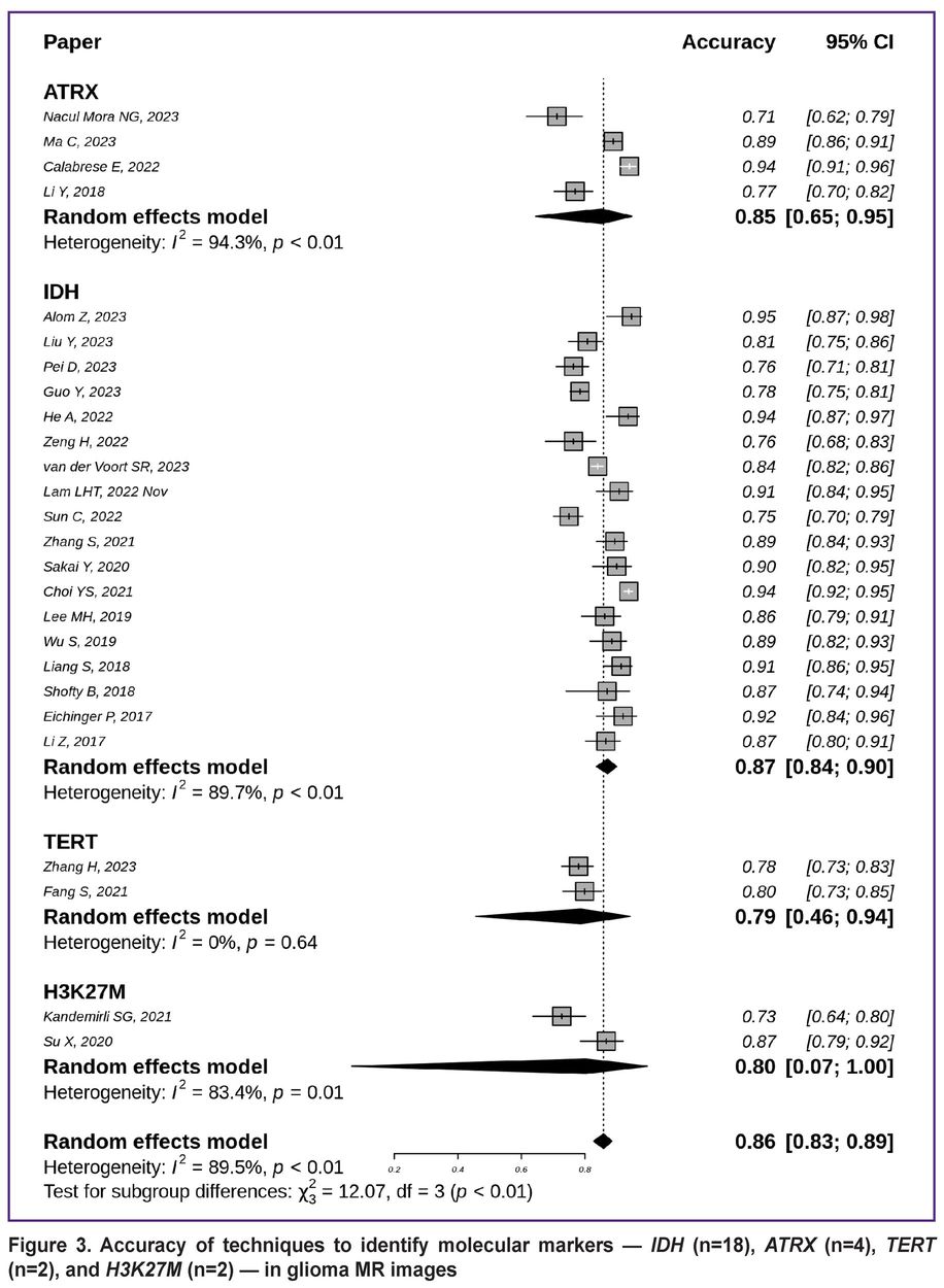 We analyzed 42 publications utilizing radiomics and machine learning to predict molecular biomarker status in glial tumors based on MRI data. The analysis covered mutations in the IDH, ATRX, BRAF, and H3K27M genes, as well as TERT promoter mutations, 1p/19q codeletion, MGMT promoter methylation, and proliferative activity (Ki-67 labeling index). The overall accuracy of these techniques was high and equaled 0.86 [0.83; 0.89]. At the same time, the studies demonstrated significant methodological heterogeneity, in particular, related to the lack of uniform standards to select the location, size, and shape of the area of interest for obtaining radiomic features. This greatly hinders reproduction of the experimental results in clinical practice. Therefore, standardization of radiomics procedures remains relevant for further research of glial tumors.