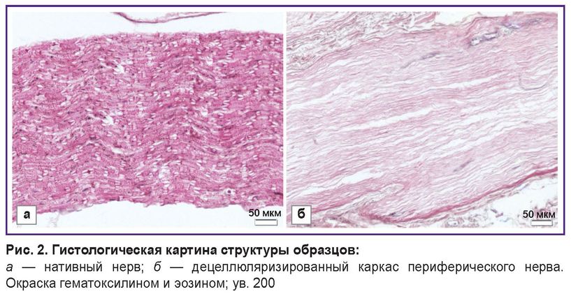 Изменения в структуре децеллюляризированного каркаса были оценены с помощью гистологического окрашивания в сравнении с нативным нервом. Окрашивание гематоксилином и эозином продемонстрировало сохранение общей гистологической архитектуры нерва после удаления клеточных элементов (рис. 2).