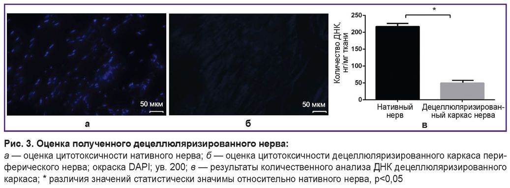 В образцах децеллюляризированного каркаса нерва отсутствовали клеточные ядра, что подтверждало эффективность процесса децеллюляризации. Содержание ДНК в нативных образцах составило 221,51±1,36 нг/мг ткани, в децеллюляризированном каркасе нерва — 48,17±4,25 нг/мг ткани, что в 4,59 раза ниже значений для нативного нерва (p<0,05) (рис. 3).