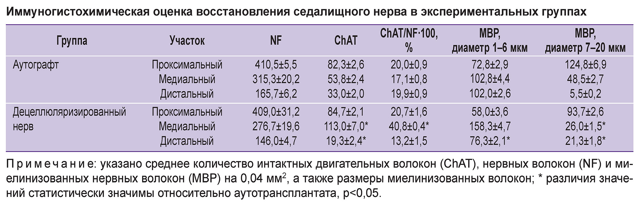Иммуногистохимический анализ показал значительное восстановление двигательных нервных волокон в медиальной части трансплантата в опытной группе по сравнению с контрольной (см. таблицу).
