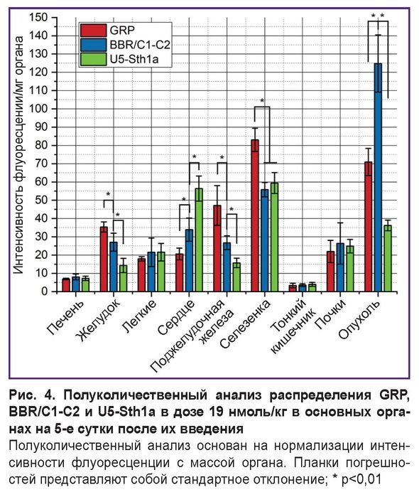 При анализе биораспределения на 5-е сутки после внутривенного введения пептидов наблюдалась следующая картина (рис. 4). Анализировали основные органы. Интенсивность сигнала флуоресценции органа была интегрирована, уменьшена с фоновым шумом и нормализована с массой органа. Основной орган накопления всех трех пептидов — селезенка. Короткий пептид GRP помимо селезенки локализовался в желудке и поджелудочной железе. Сигнал BBN/C1-C2 детектировался в данных органах значительно слабее, но был выше, чем сигнал токсина U5-Sth1a. Особо стоит отметить повышенный сигнал флуоресценции токсина U5-Sth1a и пептида BBN/C1-C2 в сердце (хотя и в меньшей степени), что, вероятно, связано с природной мишенью выбранного токсина. В остальных органах сигнал для всех трех молекул детектировался равномерно.