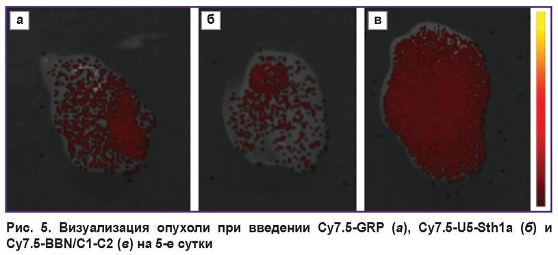 Результаты. Анализ биораспределения показал избирательное связывание молекулы BBN/C1-C2 с опухолью, а также ее способность удерживаться на поверхности опухоли до 5 дней без интернализации внутрь клеток при низком накоплении в нормальных органах и тканях.