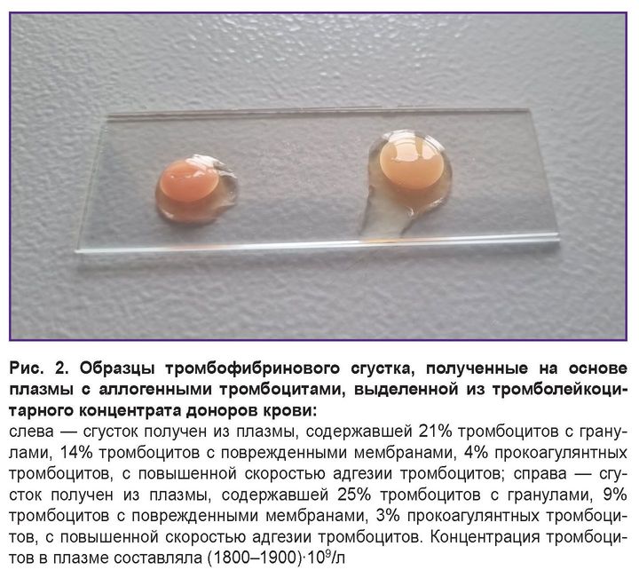 На сегодняшний день отсутствуют стандартизированные методики получения аппликативных биологических препаратов, в частности ТГ и тромбофибринового сгустка, и нет точного представления о качестве аллогенных тромбоцитов, применяемых для создания препаратов [8]. Часто ТГ готовят путем предварительной заморозки плазмы с тромбоцитами с последующей активацией плазмы препаратами кальция при температуре 37°С [9–11]. Однако такой подход сопровождается потерей многих ростовых факторов и не позволяет использовать функциональные особенности тромбоцитов при образовании ТГ в результате их криодеструкции. В связи с этим актуальным является поиск методов, направленных на повышение эффективности отбора и использования аллогенных тромбоцитов при создании аппликативных биологических препаратов.