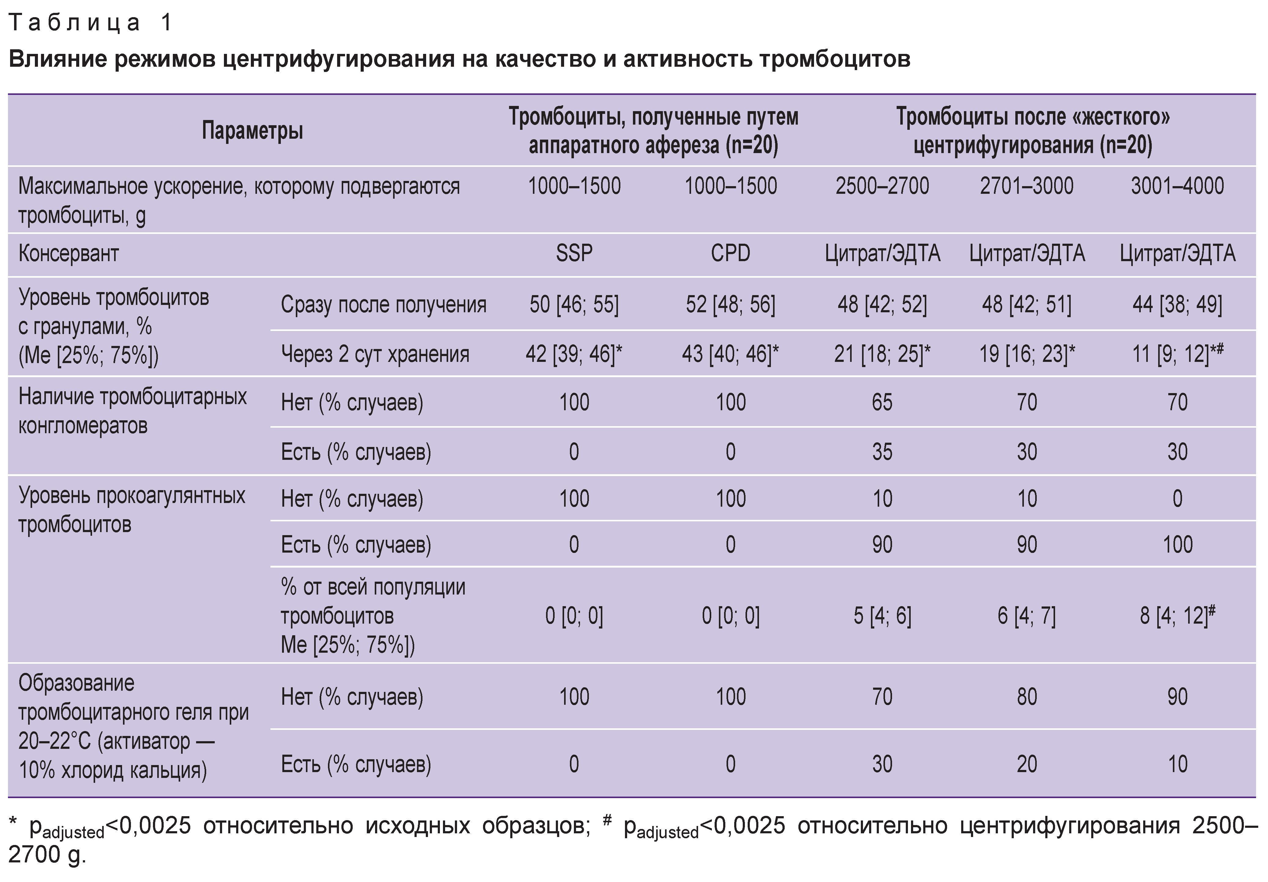 Таблица 1. Влияние режимов центрифугирования на качество и активность тромбоцитов |