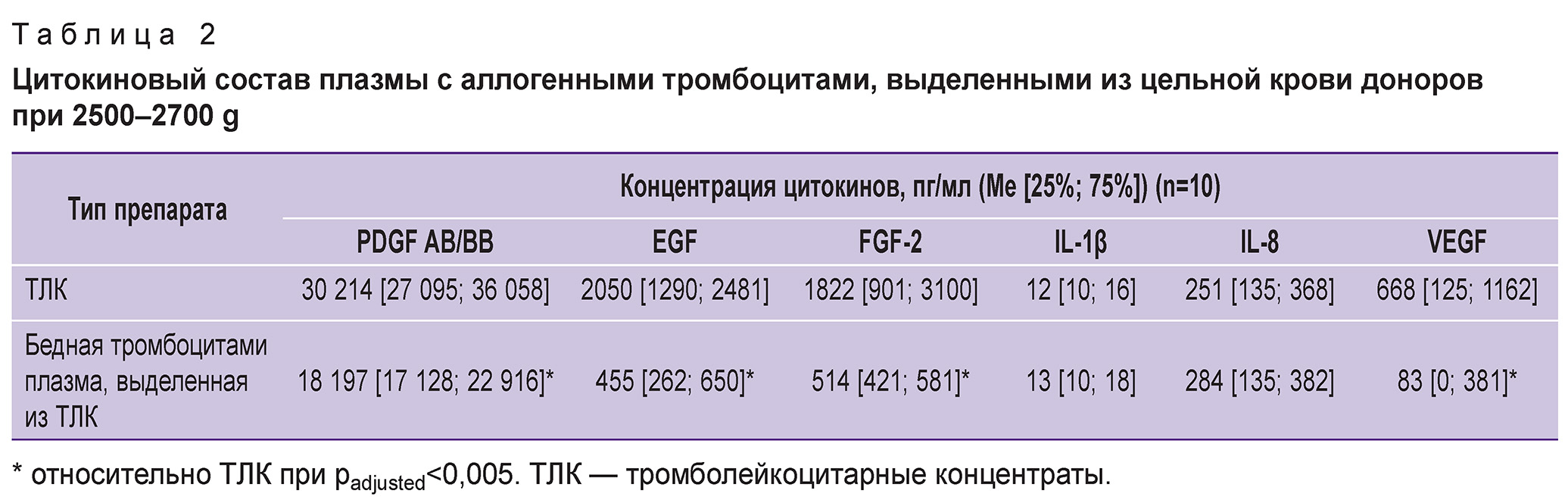 Таблица 2. Цитокиновый состав плазмы с аллогенными тромбоцитами, выделенными из цельной крови доноров при 2500–2700 g |