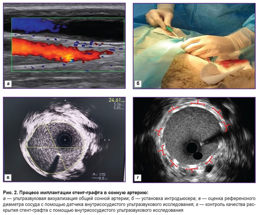 После этого параллельно датчику ВСУЗИ дистальнее на 0,5–1,0 см заводили стент-графт. После позиционирования под контролем чрескожного и внутрисосудистого УЗИ стент-графт имплантировали в общую сонную артерию. Затем проводили контроль раскрытия стент-графта с помощью ВСУЗИ, при выявлении мальпозиции и/или недораскрытия выполняли постдилатацию баллоном (до 16 атм) с повторной оценкой результата. Методом ВСУЗИ оценивали площадь раскрытия, аппозицию, а также наличие диссекций (рис. 2, г).