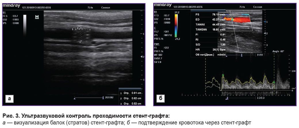 Рис. 3. Ультразвуковой контроль проходимости стент-графта: а — визуализация балок (стратов) стент-графта; б — подтверждение кровотока через стент-графт |