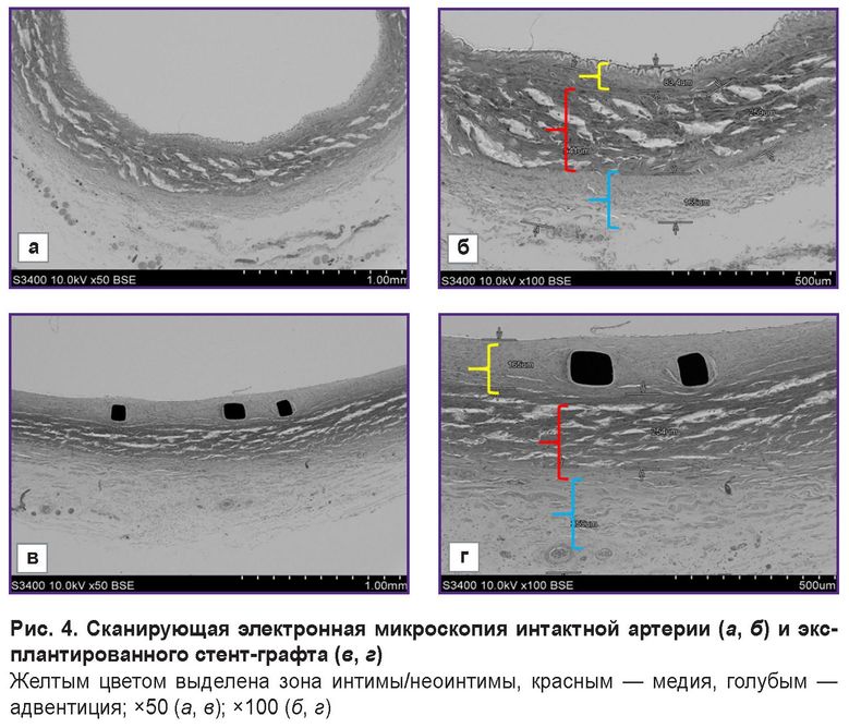 При сравнении методом СЭМ состояния интактной артерии, примыкающей к имплантированному стент-графту, и фрагмента артерии с имплантированным стент-графтом, установлено, что строение слоев артерий схоже: отчетливо визуализируются интима/неоинтима, слои медии и адвентиции (рис. 4). При увеличении в 100 раз видно, что размеры слоев медии и адвентиции в среднем составили 250 и 200 мкм соответственно как в интактной артерии, так и в артерии, содержащей стент-графт (рис. 4, б, г). Различались только размеры внутреннего слоя: толщина интимы в интактной артерии не превышала 85 мкм, в то время как толщина неоинтимы в зоне имплантации стент-графта была в 2 раза больше и достигала 165 мкм.