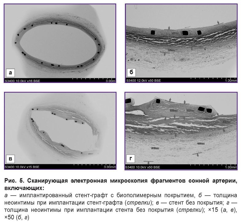Материалы и методы. На металлические коронарные стенты «Калипсо» длиной 8 мм методом электроспиннинга наносили биодеградируемое покрытие на основе сополимера поли-D,L-лактида-со-гликолида с соотношением полилактида и гликолида 50:50 и низкомолекулярного эноксапарина натрия. Покрытые стенты (стент-графты) и стенты без покрытия имплантировали в сонную артерию овец. Проходимость в динамике оценивали с помощью цветного дуплексного сканирования. Через 3 мес фрагменты «артерия–стент» были эксплантированы, зафиксированы забуференным формалином с постфиксацией тетраоксидом осмия, обезвожены в этаноле и ацетоне и затем пропитаны эпоксидной смолой. После полимеризации образцы шлифовали до необходимой глубины и полировали. Для повышения контрастности после полировки образцы обрабатывали цитратом свинца по Рейнольдсу. Образцы визуализировали посредством сканирующей электронной микроскопии в режиме обратно-рассеянных электронов.