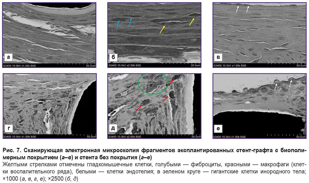 Поверхность неоинтимы, обращенной к кровотоку, у изучаемых образцов также существенно различалась: при имплантации стент-графта на поверхности визуализировали ровный слой эндотелиальных клеток (рис. 7, в), в то время как на поверхности стента без покрытия — эндотелиоподобные клетки, под которыми располагался рыхлый субэндотелиальный слой, представленный фибробластами и макрофагами (рис. 7, е).