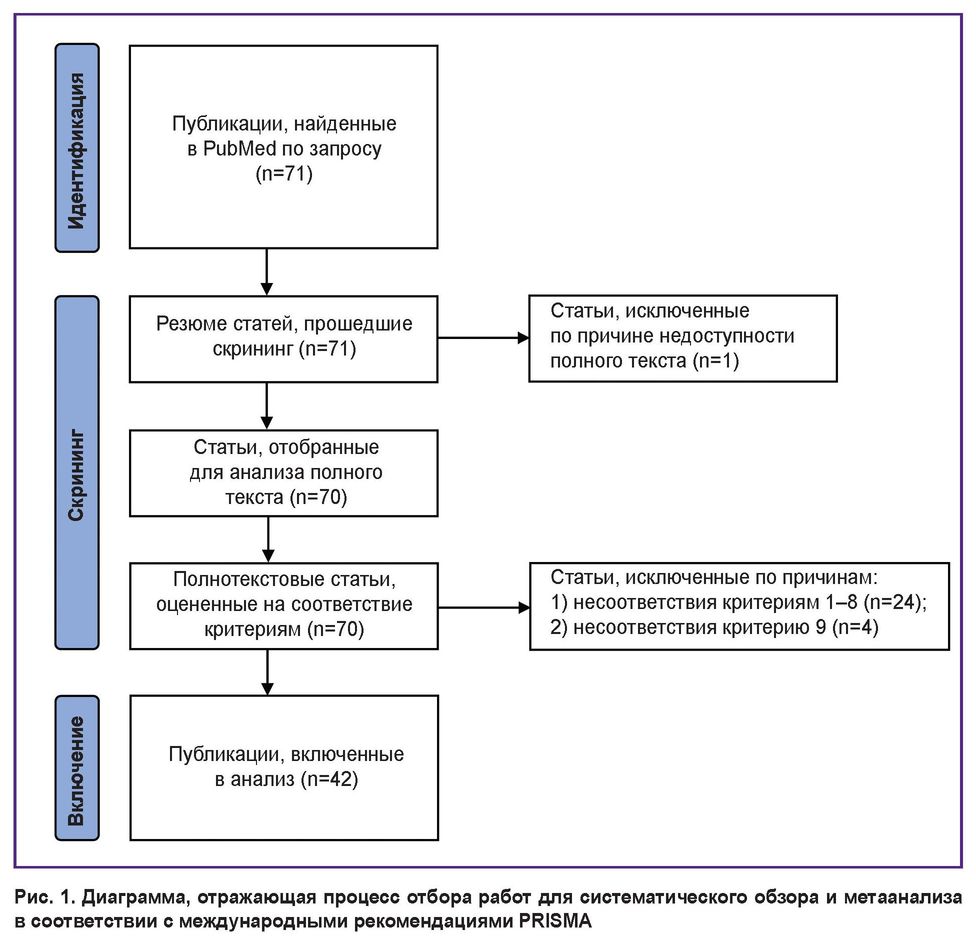 Исследование проведено в соответствии с международными рекомендациями PRISMA (PreferredReportingItemsforSystematicReviewsandMeta-Analyses) по подготовке систематических обзоров и метаанализов [6].