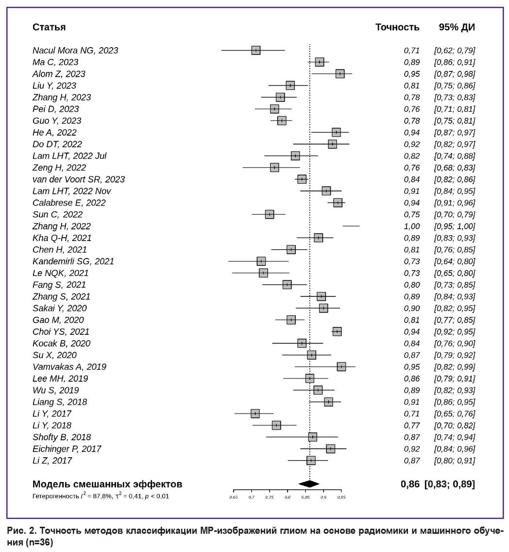 На рис. 2 [7–42] представлена точность моделей машинного обучения и ее обобщение по 36 работам из 42, для которых удалось оценить метрики точности. Обобщенная точность в проанализированных работах составила 0,86 с 95% ДИ [0,83; 0,89].